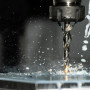 High-speed close-up of CNC drill bit in action with water splash for lubrication.